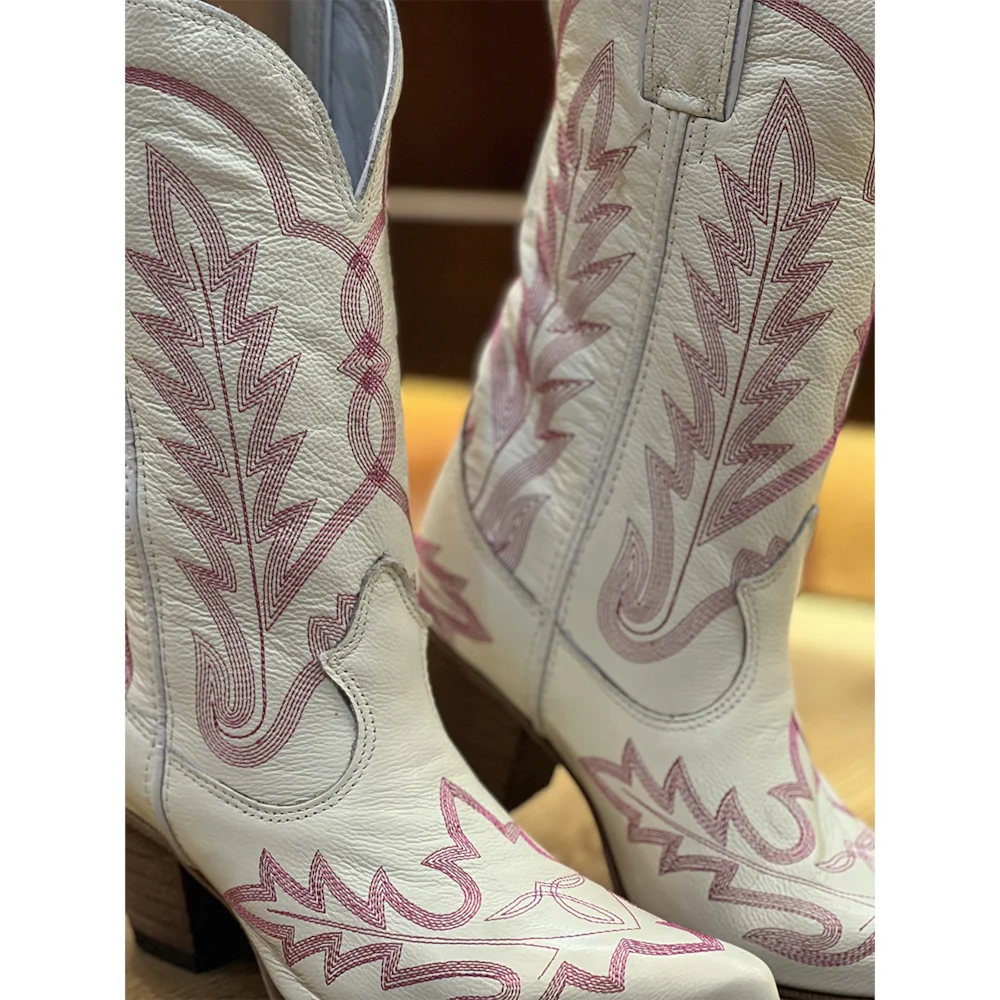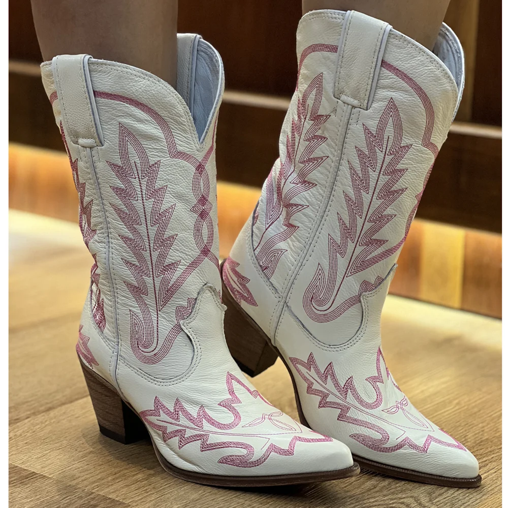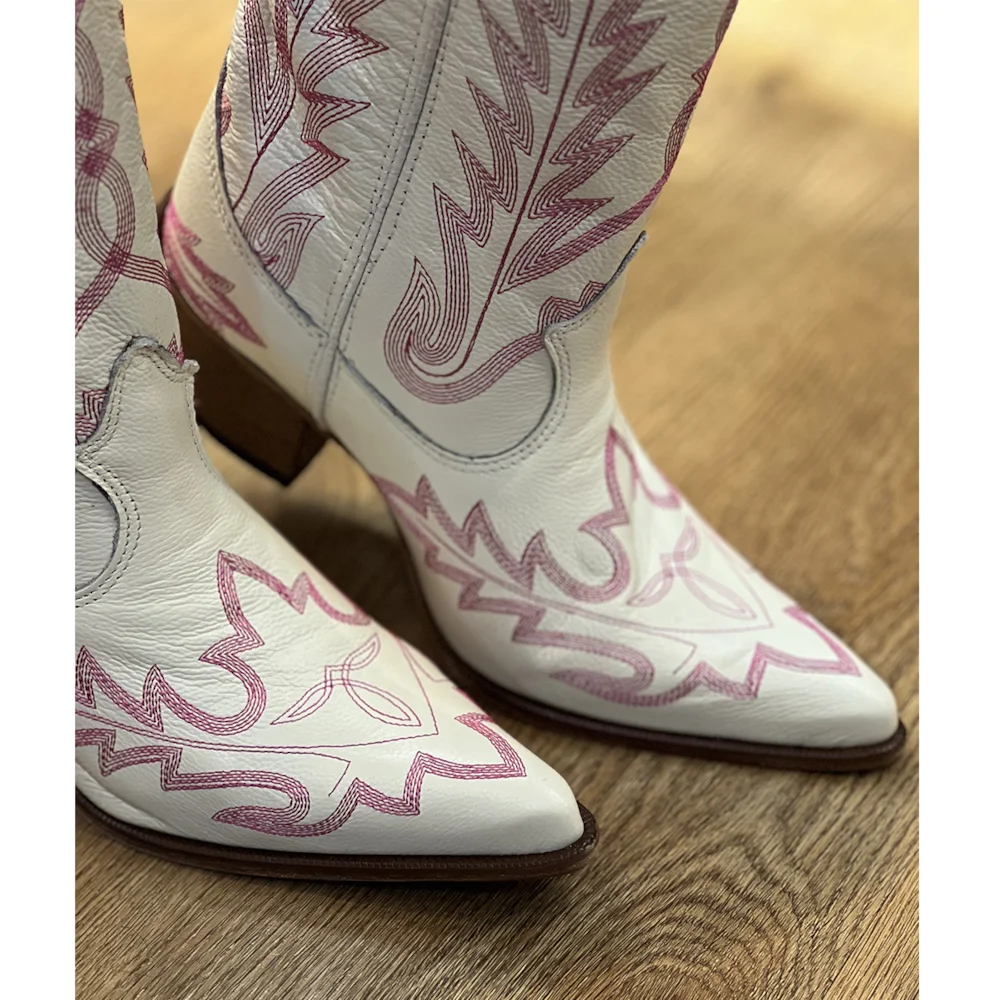 Cano fabricado em couro bonivo, na cor Marfim, com bordados. Forrada internamente em couro. Puxador nas laterais.