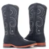 Cano de aproximadamente 30cm, também em couro bovino na cor Dlls Café, com bordados e aplique de rebites Preto. Possui puchador nas laterais do cano, facilitando o calçar. Cano forrado em couro com costuras de proteção personalizada com logo Goyazes.