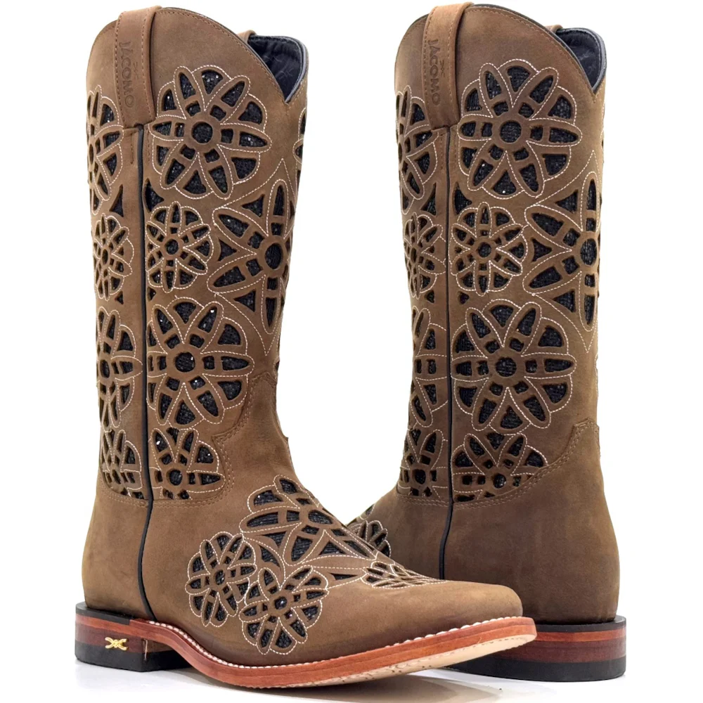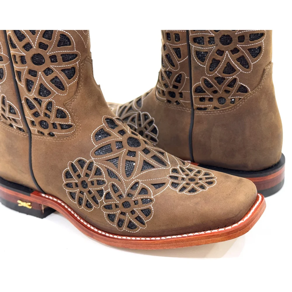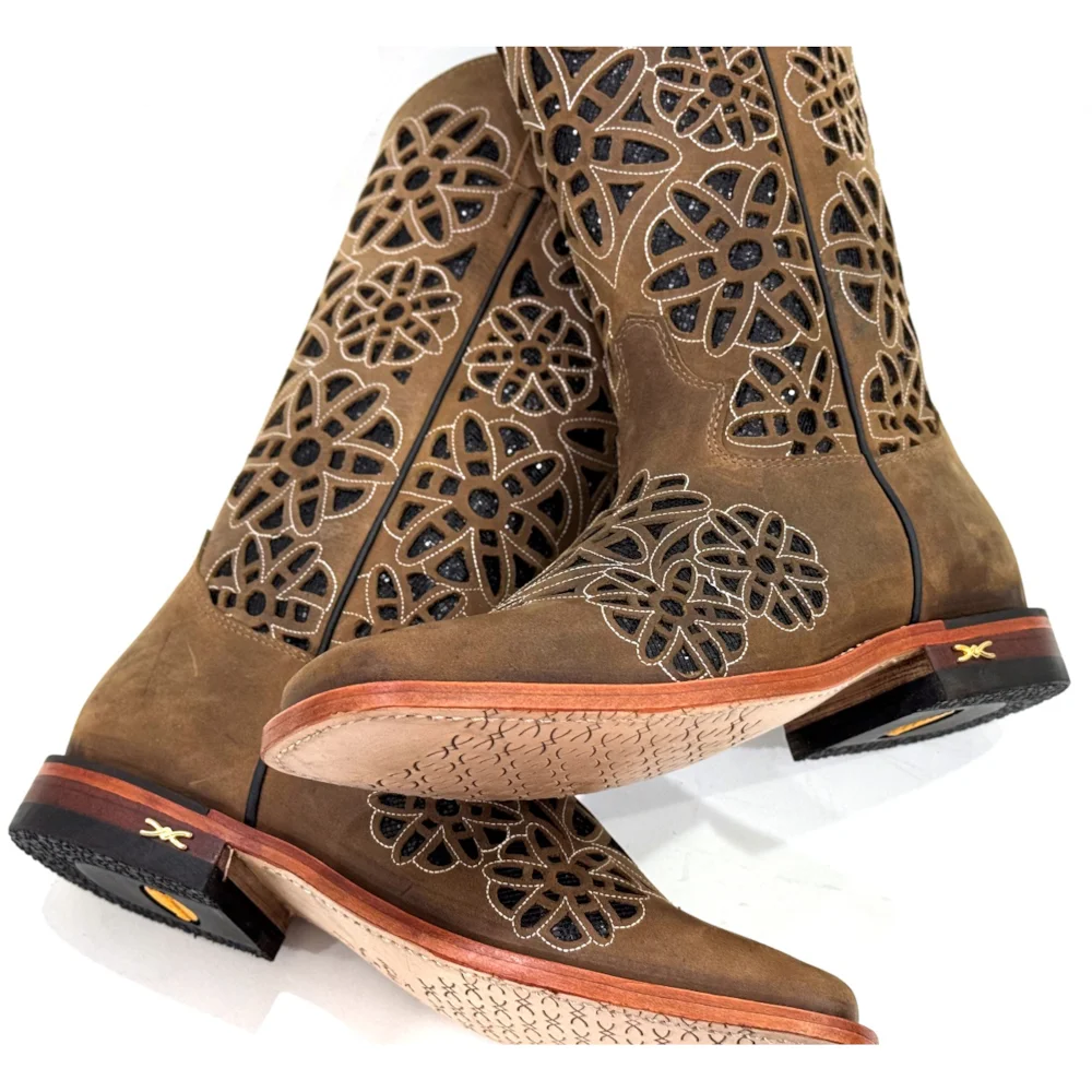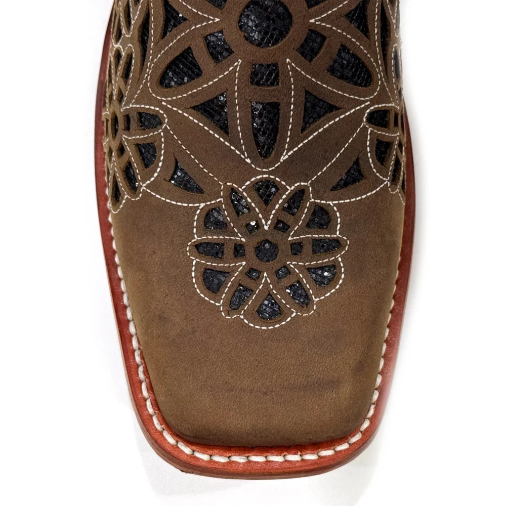 Pé fabricado em couro Bovino na cor Mustang Havana. Bico Quadrado, com entalhes, bordados e brilho dentro do entalhe.