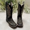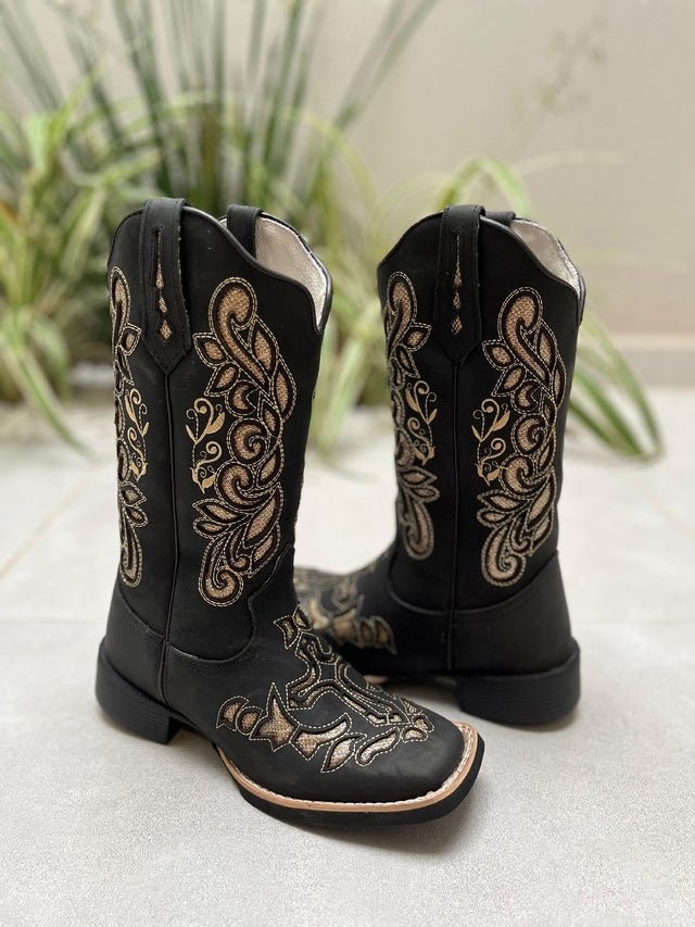 Bota Texana Laser Cruz Glitter Dourado Couro Preto fabricada toda com couro 100% legítimo.