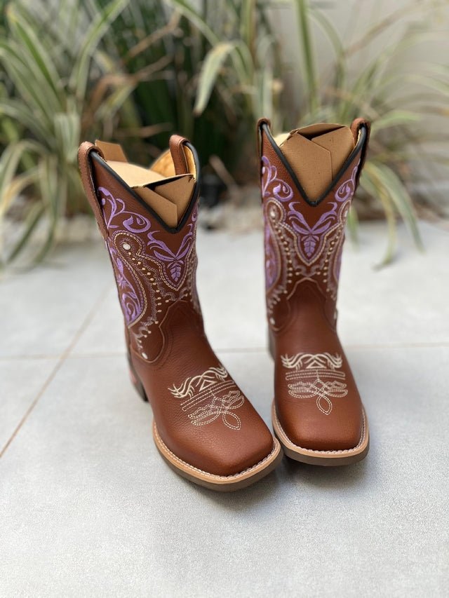 Bota Texana Tribal Lilás Florão Bege Couro Marrom fabricada toda com couro 100% legítimo.