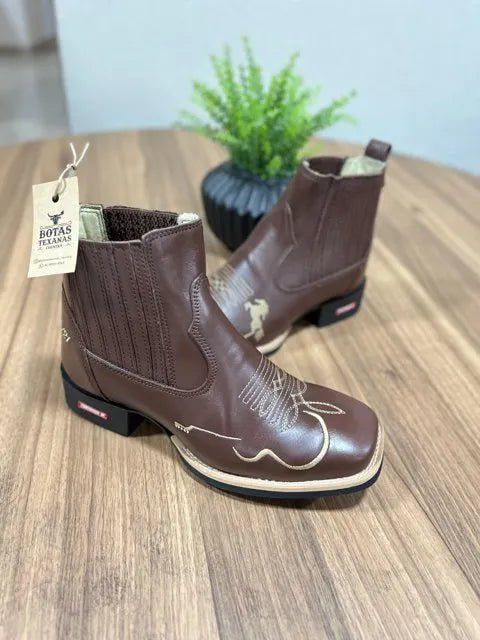 Botina Guilherme – Couro Látego Marrom/ Bordado Violão e Cavalo Bege