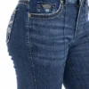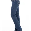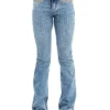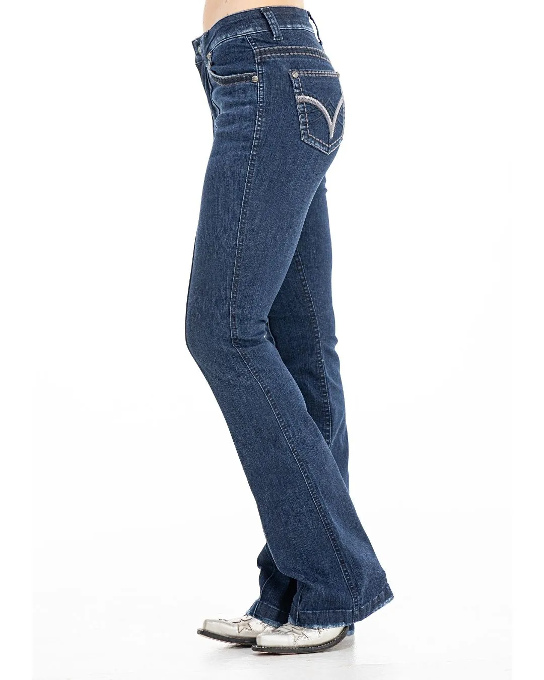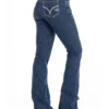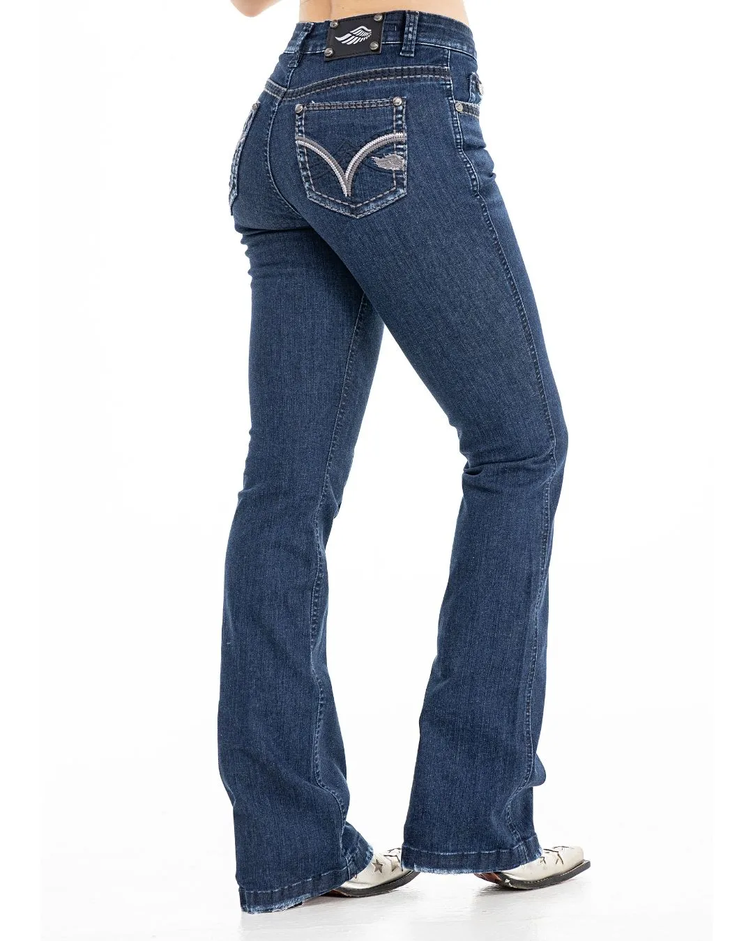 Calca jeans country feminina modelagem flare cos medio. Detalhe de vinco centralizado nas parte frontal das pernas. Bordado decorativo de pontos rusticos na pala,boca de bolso frontal e bolso traseiro. Lavanderia escura. Aviamentos personalizados.
