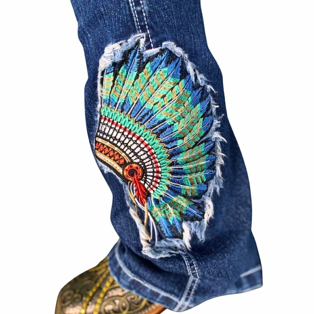 O modelo boot cut valoriza as curvas femininas, enquanto a cor amaciada confere uma elegância discreta. Os detalhes em bordado de cocar tribal na perna e nos bolsos adicionam um toque único e autêntico, fazendo da calça um verdadeiro destaque no seu guarda-roupa.