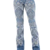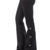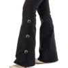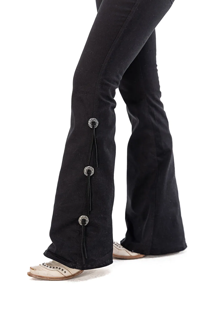 Calca sarja preta/preto country modelagem flare com barra mais ampla que o modelo tradicional, possui cos medio. Bordado com pontos decorativos na pala e bolsos frente e costas. Decoracao de conchos em metal prata velho e tiras de couro nas laterais.