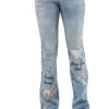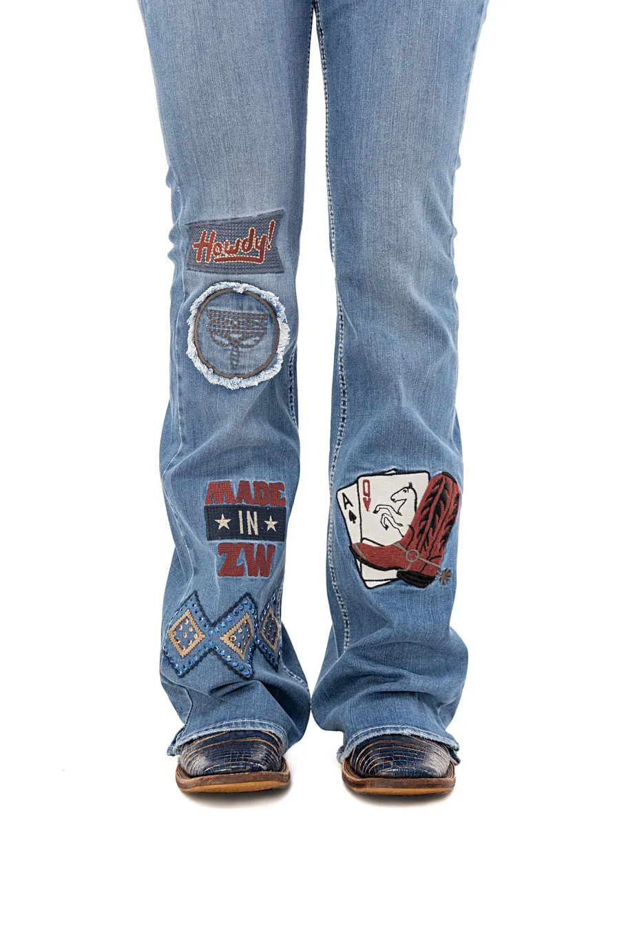 Calca jeans country modelagem flare em cos medio. Bordado com pontos decorativos na pala e bolsos frente e costas. Decoracao de patchs bordados com tematica americana: bandeira, brasao, ferradura, estrelas, cartas, botas. Bolso traseiro bordado com asa. Lavagem media com detalhes de desgaste.