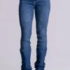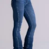 Com um corte justo que valoriza a silhueta, esse modelo apresenta detalhes em tachas metálicas nos bolsos frontais e ao longo das laterais das pernas, adicionando um toque de personalidade western ao jeans tradicional.
