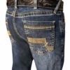 O detalhe em bege/dourado bordado no bolso adiciona um toque de sofisticação ao modelo, enquanto a cor jeans proporciona versatilidade para diversas combinações.