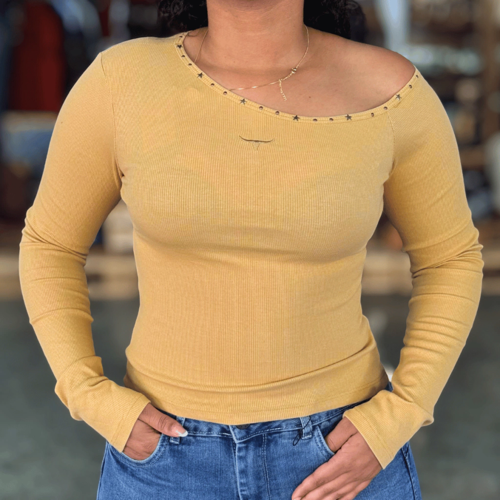 A Camiseta Canelada Manga Longa é a peça ideal para quem busca um visual atual e cheio de personalidade. Seu diferencial fica por conta do detalhe aberto no ombro, adornado com estrelas de metal que trazem um toque moderno e sofisticado ao look.