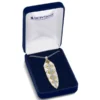 A pena pende de uma corrente ajustável de 71 cm, proporcionando leveza e movimento ao visual.