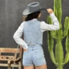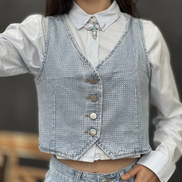 Se você busca um look deslumbrante para brilhar nos eventos country e baladas, o Conjunto B&C Shorts e Colete Lola Shine é a escolha perfeita! Composto por um colete acinturado e shorts curto, ambos no jeans escuro com aplicação de strass, esse conjunto une estilo e autenticidade para um visual marcante e cheio de atitude.