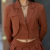 O Conjunto College Style Terra Cota foi criado para destacar a sua personalidade com muito estilo e atitude! Composto por blazer cropped e saia no estilo líder de torcida americana, traz um visual jovem e moderno, perfeito para quem ama produções divertidas e cheias de autenticidade.