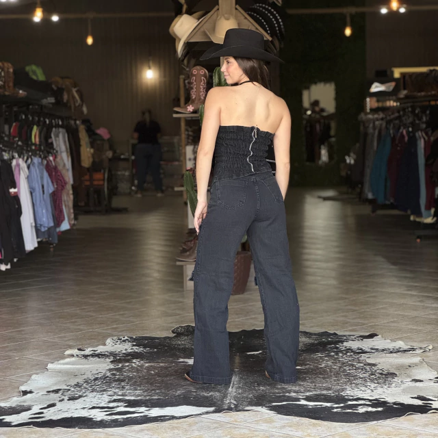 O Conjunto Anastasia Assimétrico Preto da marca Dama é a combinação perfeita entre modernidade e estilo country! Composto por uma calça jeans wide leg e um tube top tomara que caia com design assimétrico, o modelo traz um visual ousado e cheio de atitude.