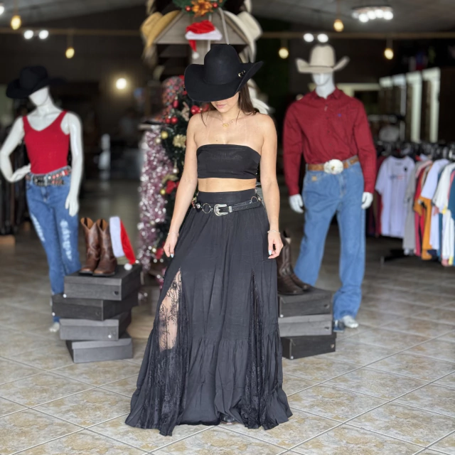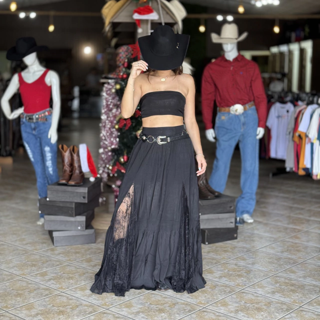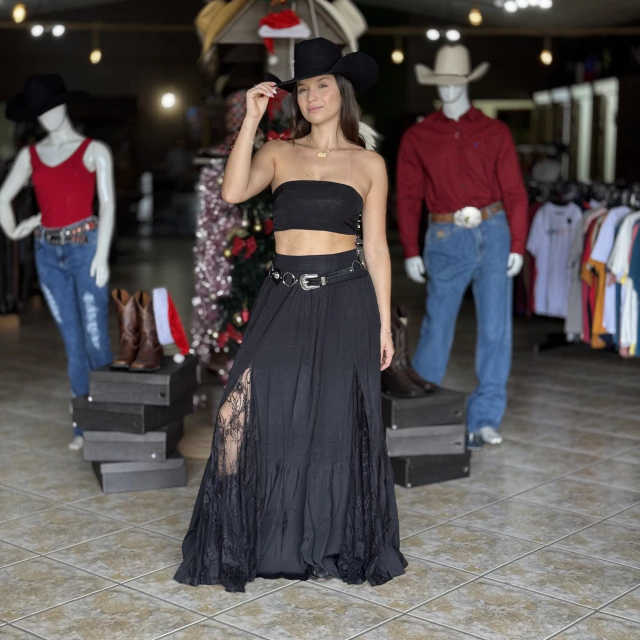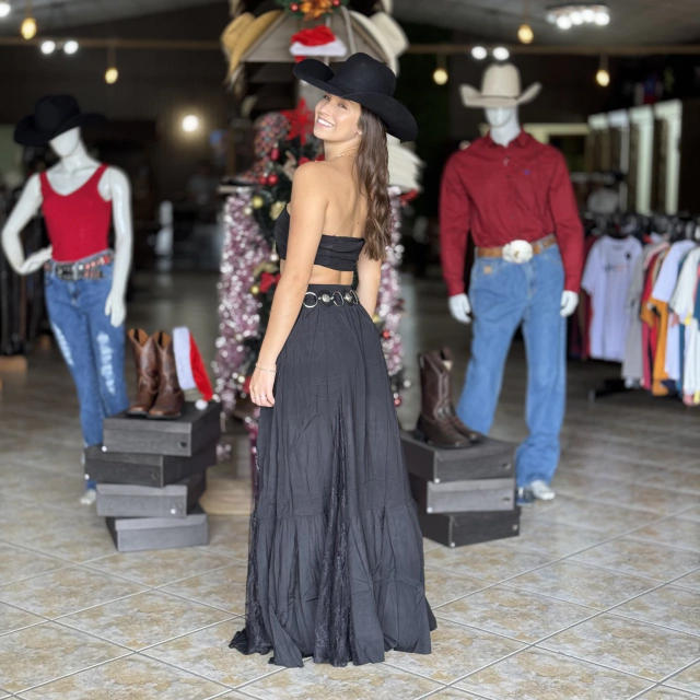 Sobre o Conjunto Western Preto Top e Saia Longa – Unicorn