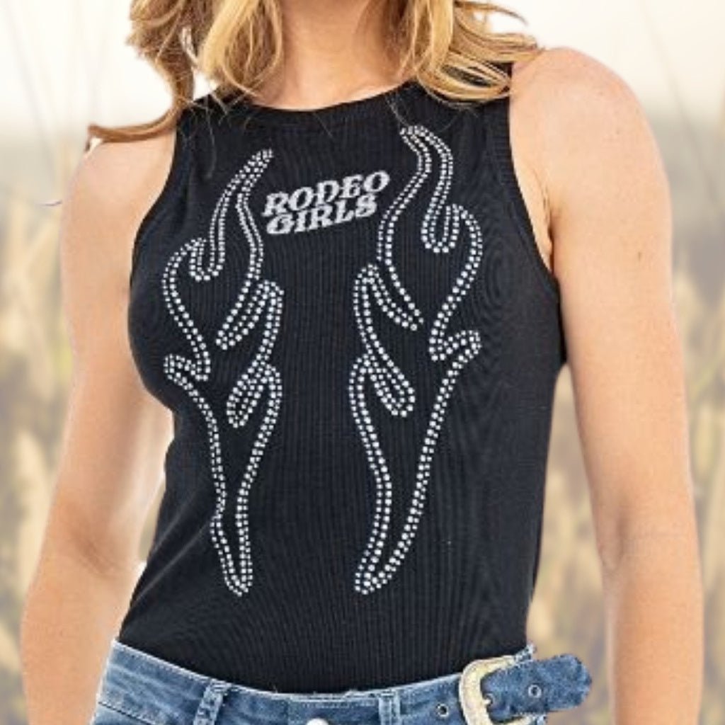 A Regata Feminina em Malha Canelada na cor preta é a escolha ideal para quem busca estilo e conforto. Com modelagem acinturada e ajustada ao corpo, ela valoriza a silhueta feminina. A gola redonda e os bordados em linha metalizada prata com o texto “Rodeo Girls” adicionam um toque especial, enquanto o ornamento em cristais traz um charme extra, inspirado em cano de bota.