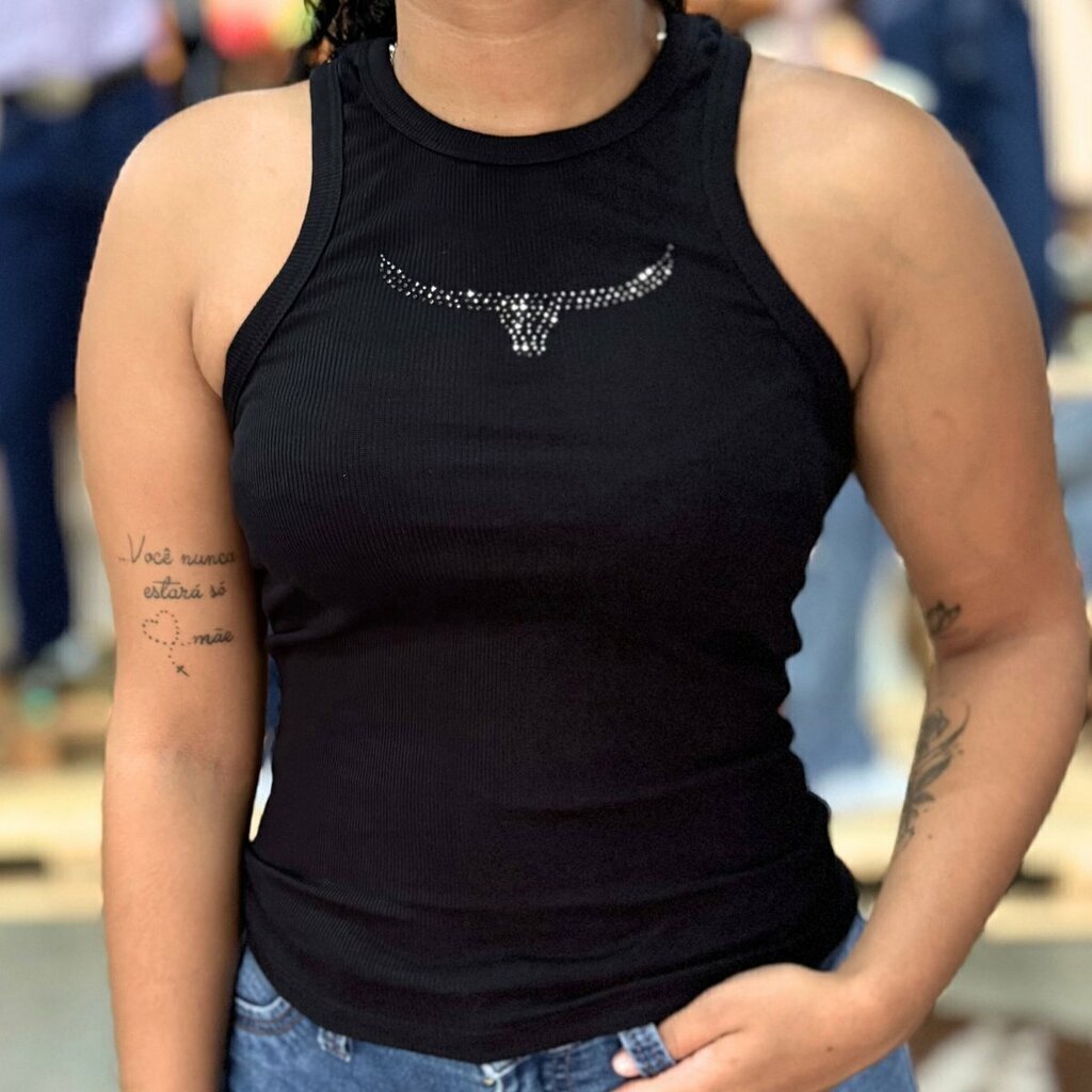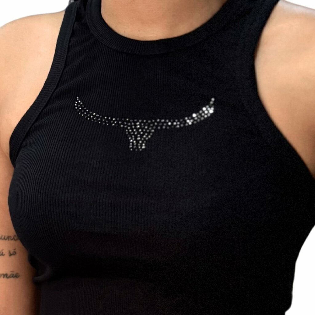 Os detalhes da logo em strass adicionam um toque de sofisticação, tornando essa regata perfeita para diversas ocasiões.