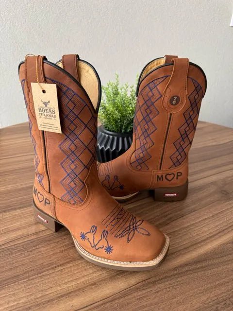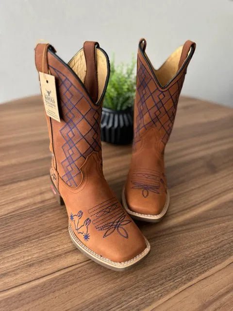 Texana Antônio – Couro Fóssil Havana/Bordado Geométrico Azul Marinho