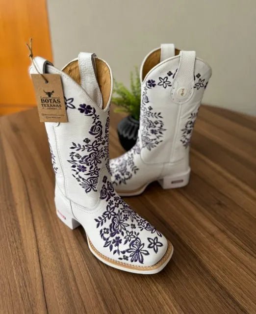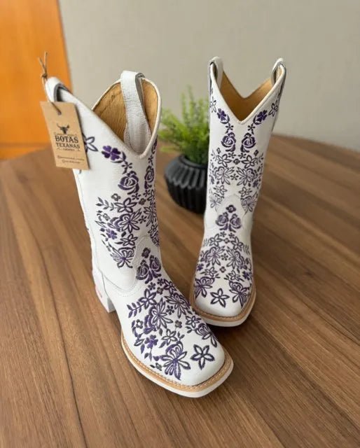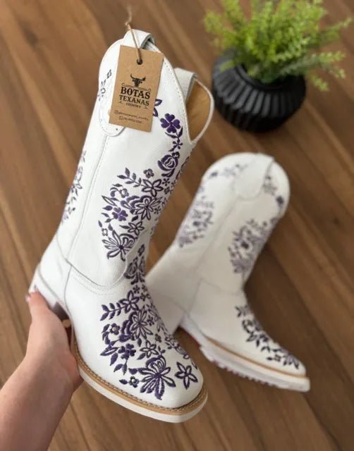 Texana Maitê – Couro Floatter Branco/Bordado Lilás Florência com Metais